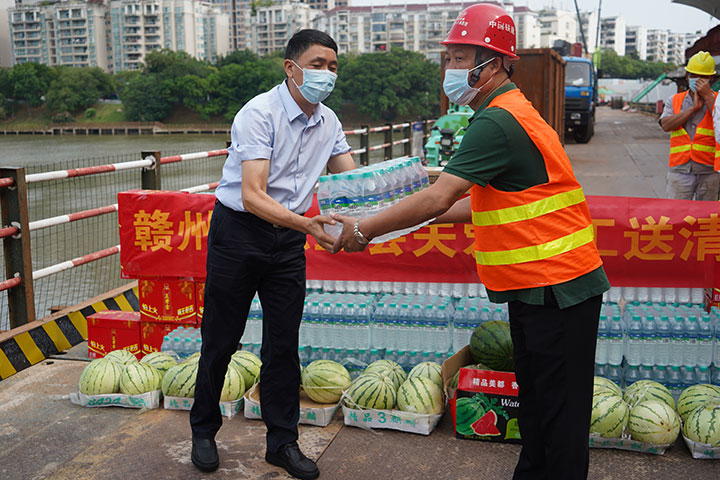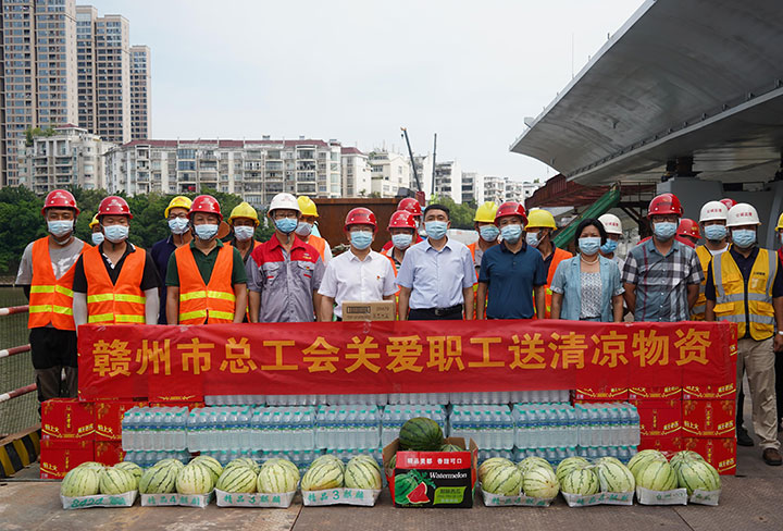 在慰問(wèn)現(xiàn)場(chǎng),賴定銘一行為南河大橋拓寬改造(二期)工程項(xiàng)目高溫下堅(jiān)守崗位的一線職工發(fā)放了西瓜、礦泉水、王老吉等防暑降溫物品,并與項(xiàng)目一線職工交流談心,詢問(wèn)了職工積極推進(jìn)項(xiàng)目建設(shè)進(jìn)展情況,聽取了贛州城投集團(tuán)高溫津貼發(fā)放情況和落實(shí)高溫天氣作業(yè)勞動(dòng)保護(hù)的有關(guān)措施,叮囑大家要科學(xué)安排高溫期間的施工任務(wù),要堅(jiān)持勞逸結(jié)合,特別要注意身心健康和施工安全,要認(rèn)真做好項(xiàng)目工地疫情防控工作。