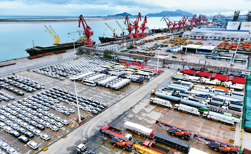 江蘇全面把握在全國(guó)開(kāi)放格局中的發(fā)展定位,發(fā)揮“一帶一路”交匯點(diǎn)優(yōu)勢(shì),聚焦建設(shè)具有世界聚合力的雙向開(kāi)放樞紐的目標(biāo),加快推進(jìn)高水平對(duì)外開(kāi)放,外貿(mào)進(jìn)出口總額連續(xù)多年居全國(guó)前列。圖為2024年10月18日,在江蘇省連云港東方港務(wù)分公司碼頭,大批國(guó)產(chǎn)車(chē)輛集港準(zhǔn)備裝船(無(wú)人機(jī)照片)。新華社發(fā) 王春/攝
